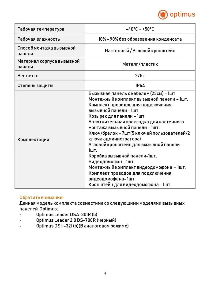 Расшифровка* Данная модель видеодомофона совместима со следующими моделями вызывных панелей Optimus: • Optimus Leader DSA-30IR (b) • Optimus Leader 2.0 DS-700R (черный)