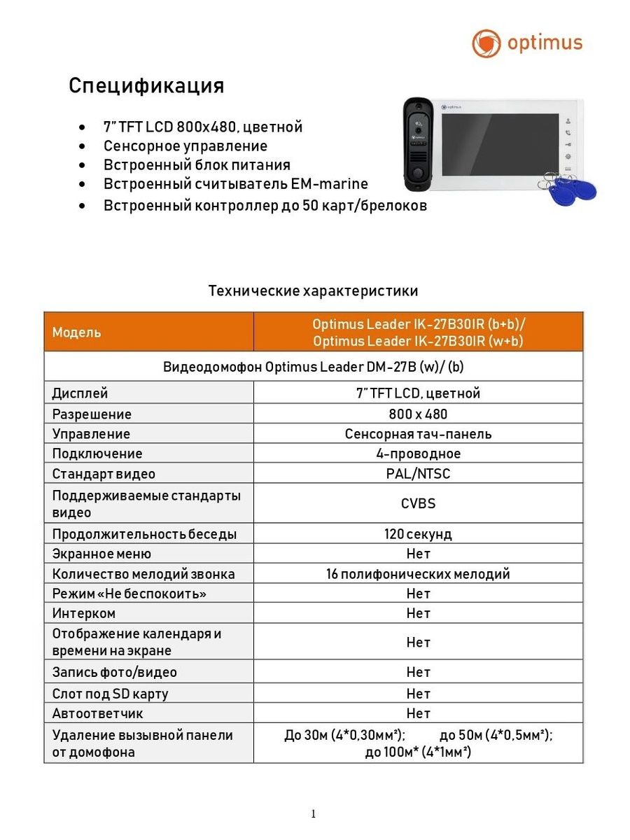 Расшифровка* Данная модель видеодомофона совместима со следующими моделями вызывных панелей Optimus: • Optimus Leader DSA-30IR (b) • Optimus Leader 2.0 DS-700R (черный)
