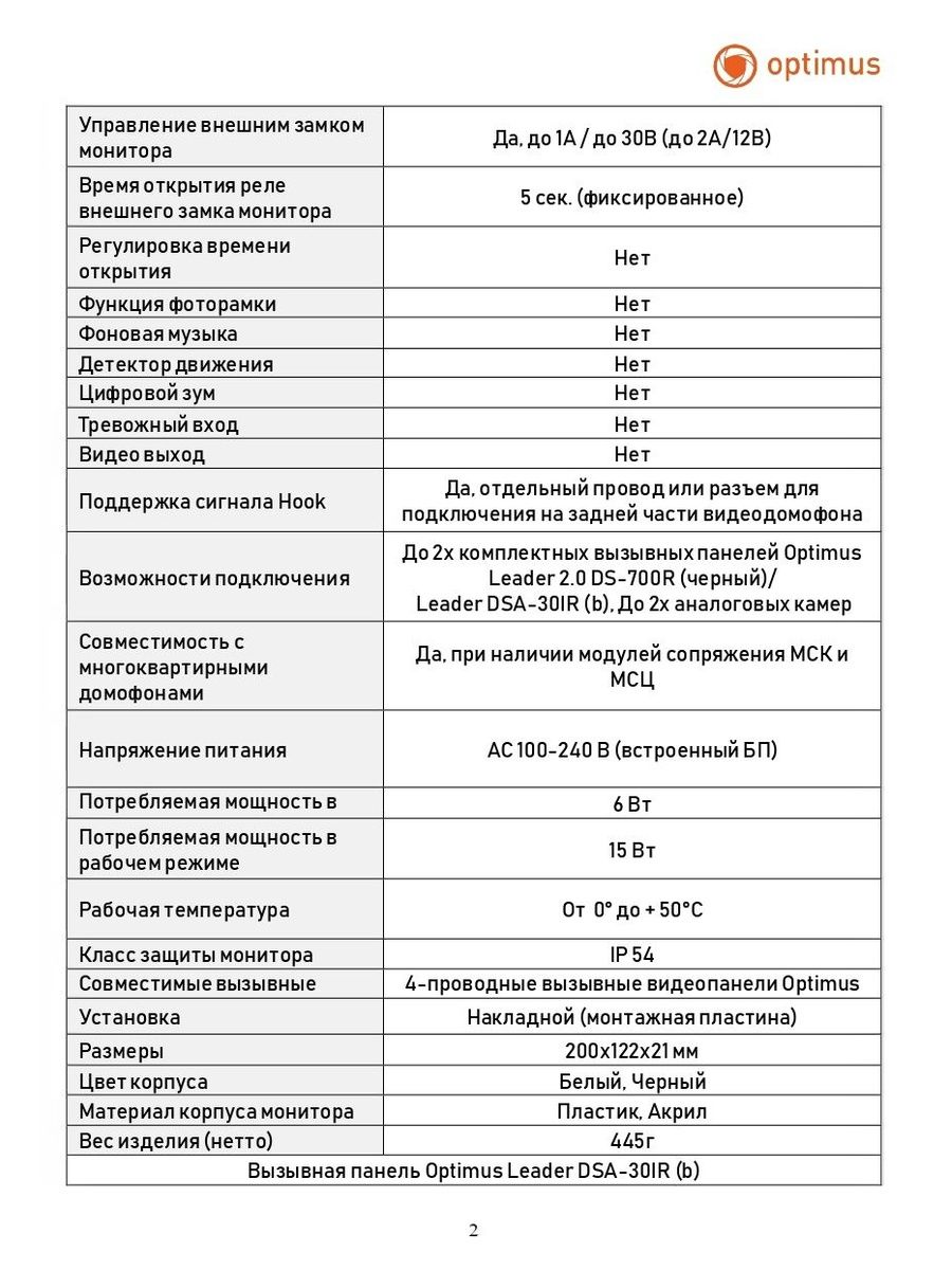 Расшифровка* Данная модель видеодомофона совместима со следующими моделями вызывных панелей Optimus: • Optimus Leader DSA-30IR (b) • Optimus Leader 2.0 DS-700R (черный)