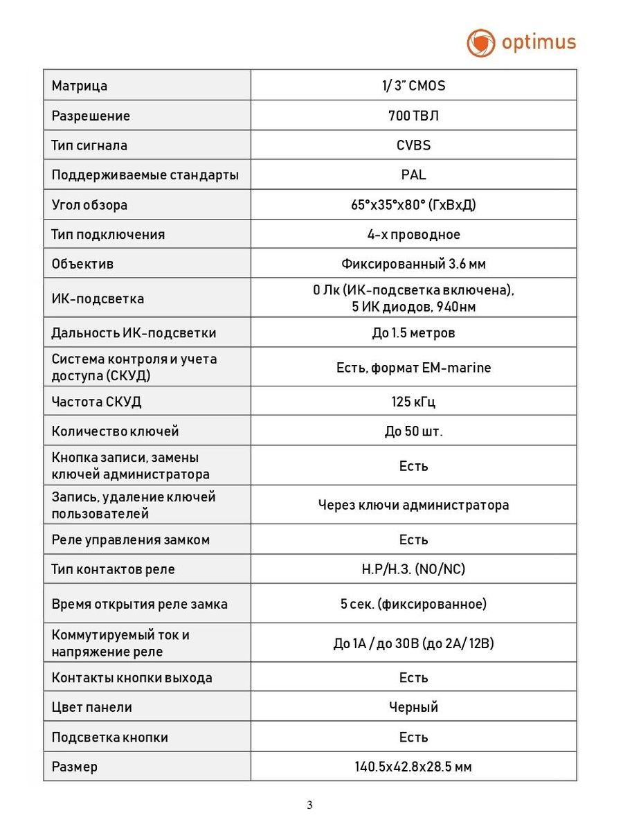 В вызывной панели Optimus Life DSA-30IR (b) встроена 1/ 3” CMOS цветная матрица с разрешением 700 ТВЛ, которая гарантирует Вам изображение отличного качества. Панель оснащена ИК-подсветкой дальностью до 1,5 м, что позволит вести работу устройства при отсутствии освещения. Угол обзора камеры до 80°, Тип сигнала CVBS. Панель адаптирована встроенной системой контроля и учета доступа (СКУД).