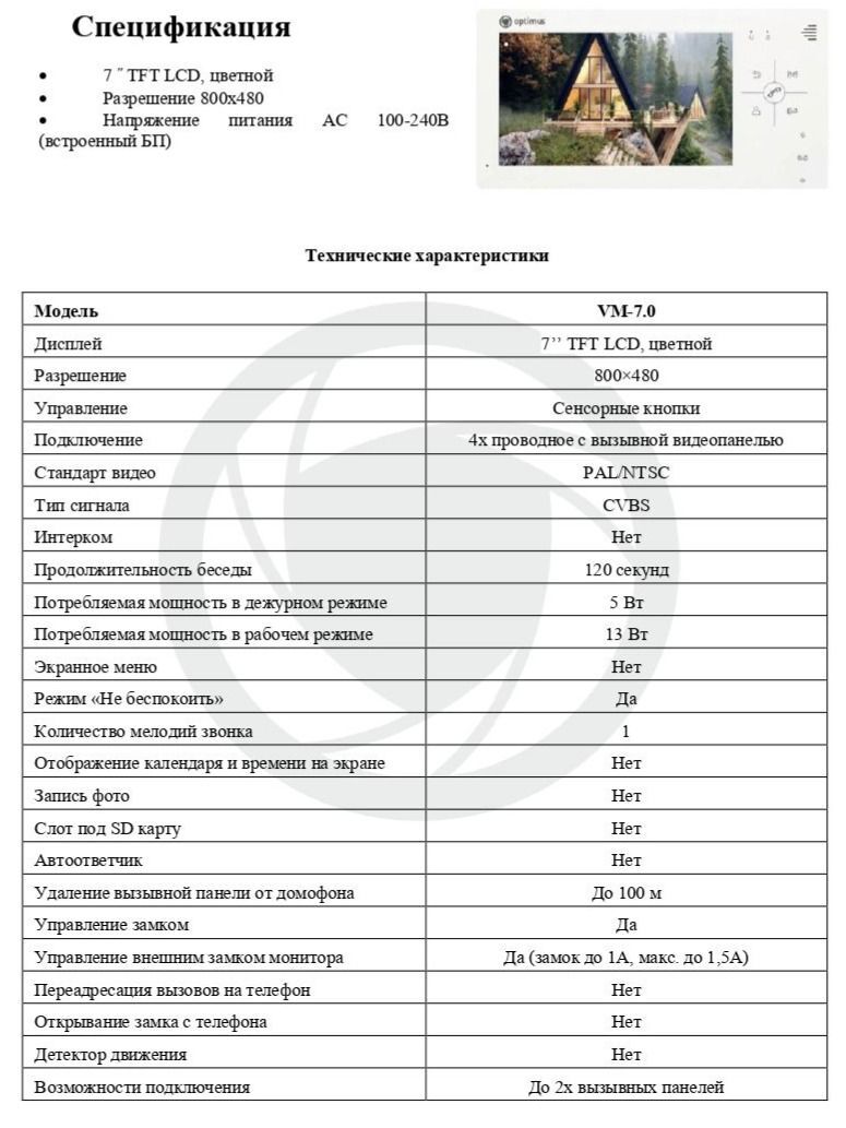 Цветной монитор видеодомофона Optimus VM-7.0 оборудован 7˝ TFT LCD дисплеем, с разрешением 800х480 пикселей. Видеодомофон поддерживает стандарты видео PAL/NTSC. Продолжительность беспрерывной беседы достигает 2 минут. Вызывная панель при этом может располагаться от видеодомофона на расстоянии до 100м. К домофону возможно подключить 2 вызывные панели. С монитором совместимы 4-проводные вызывные видеопанели. Устанавливается накладным способом при помощи пластины, которая идет в комплекте.