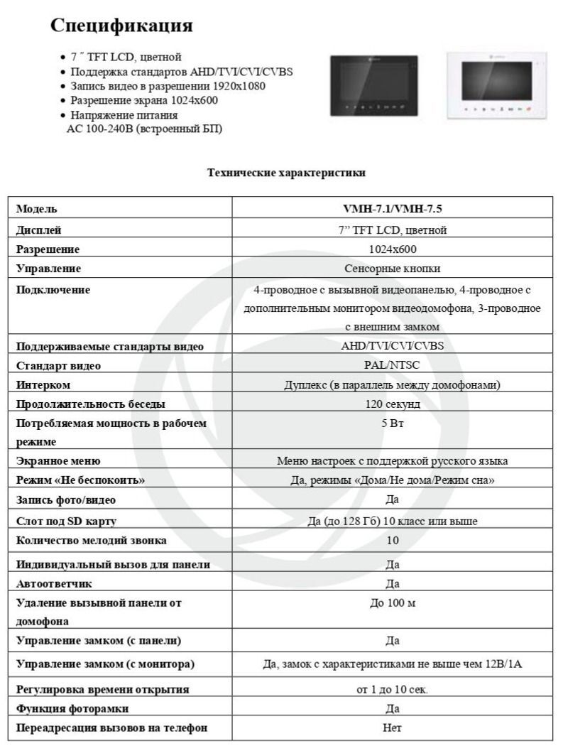 7” TFT LCD, цветной, разрешение 1024x600, поддержка стандартов AHD/TVI/CVI/CVBS, продолжительность беседы 120 сек., Запись видео в разрешении 1920х1080, подключение 4-проводное с вызывной видеопанелью, 4-проводное с дополнительным монитором видеодомофона, 3-проводное с внешним замком, управление сенсорные кнопки, экранное меню с поддержкой русского языка, запись фото/видео,автоответчик, детектор движения. Возможности подключения до 2х вызывных панелей, до 2х камер AHD-H/AHD-M/CVBS, до 6х мониторов VMH-7.1/VMH-10.1. Управление замком, SD-card до 128 Гб (10 класс или выше), напряжение питания AC 100-240 В (встроенный БП), рабочая температура 0°С до +50°С, размер 225х151х23 мм, 524 гр. Монтаж накладной (монтажная пластина).