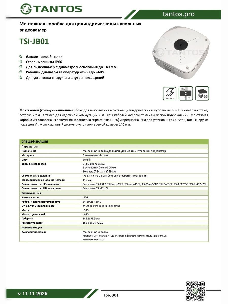 Монтажная (коммутационная) коробка предназначена для выполнения монтажа видеокамер TANTOS на вертикальной или горизонтальной поверхности внутри помещений или на улице, а так же для надежной коммутации и защиты кабелей камеры от механических повреждений. Уровень брызго-пылезащищенности - IP66.Максимальный диаметр устанавливаемой камеры 140мм.