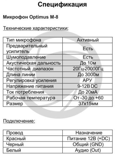 Optimus M-8 - активный микрофон с автоматической регулировкой усиления. Предназначен для прослушивания и записи звуковой обстановки в помещении в пределах 10 метров от самого устройства. Питающее напряжение может подаваться в диапазоне от 9 до 12 В, что обеспечивает нормальную работу микрофона при длине линии до связанного с ним устройства не более 3000 метров. Встроенный усилитель поддерживает низкий уровень шума.