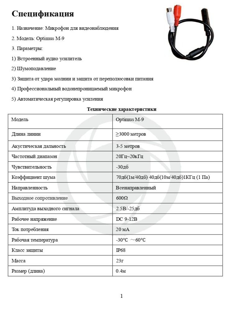 Optimus M-9 - активный микрофон с автоматической регулировкой усиления. Предназначен для прослушивания и записи звуковой обстановки в помещении в пределах 3-5 метров от самого устройства. Питающее напряжение может подаваться в диапазоне от 9 до 12 В, что обеспечивает нормальную работу микрофона при длине линии до связанного с ним устройства не более 3000 метров. Встроенный усилитель поддерживает низкий уровень шума.