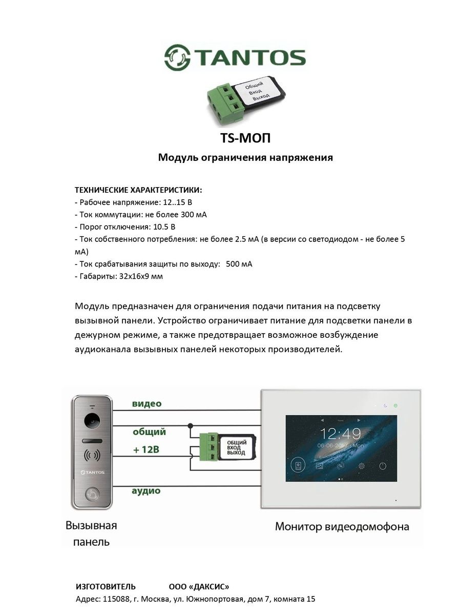 Модуль ограничения напряжения. Модуль предназначен для ограничения подачи питания на подсветку кнопки вызова вызывной панели. Устройство ограничивает питание для подсветки кнопки вызова панели в дежурном режиме, а также предотвращает возможное возбуждение аудиоканала вызывных панелей некоторых производителей.