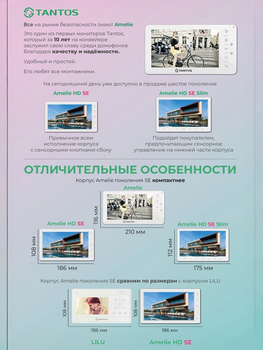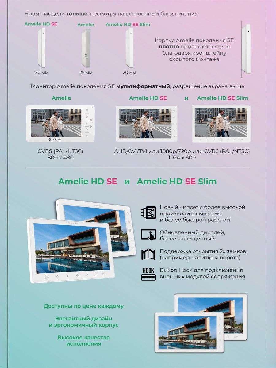 TANTOS Amelie Slim (Black) HD SE – новинка 2023 года! Изящный монитор в компактном исполнении в линейке самых популярных на российском рынке моделей домофонов. Монитор поддерживает форматы: AHD/CVI/TVI с разрешением 1080p/720p или CVBS (PAL/NTSC). Большой экран с диагональю 7” дает красочное изображение высокого качества. Управление осуществляется удобными сенсорными кнопками. Черный корпус отлично подойдет для современных жилых и офисных интерьеров в стиле лофт. К монитору могут быть подключено до двух камер и до двух вызывных панелей. Монитор позволяет создать систему из 4 мониторов с полноценным адресным интеркомом (например, для осуществления общего или адресного вызов). В TANTOS Amelie Slim HD SE есть 12 предустановленных мелодий вызова и дополнительный выход HOOK/GATE (выход HOOK предназначен для подключения модуля сопряжения, выход GATE - для управления воротами).
