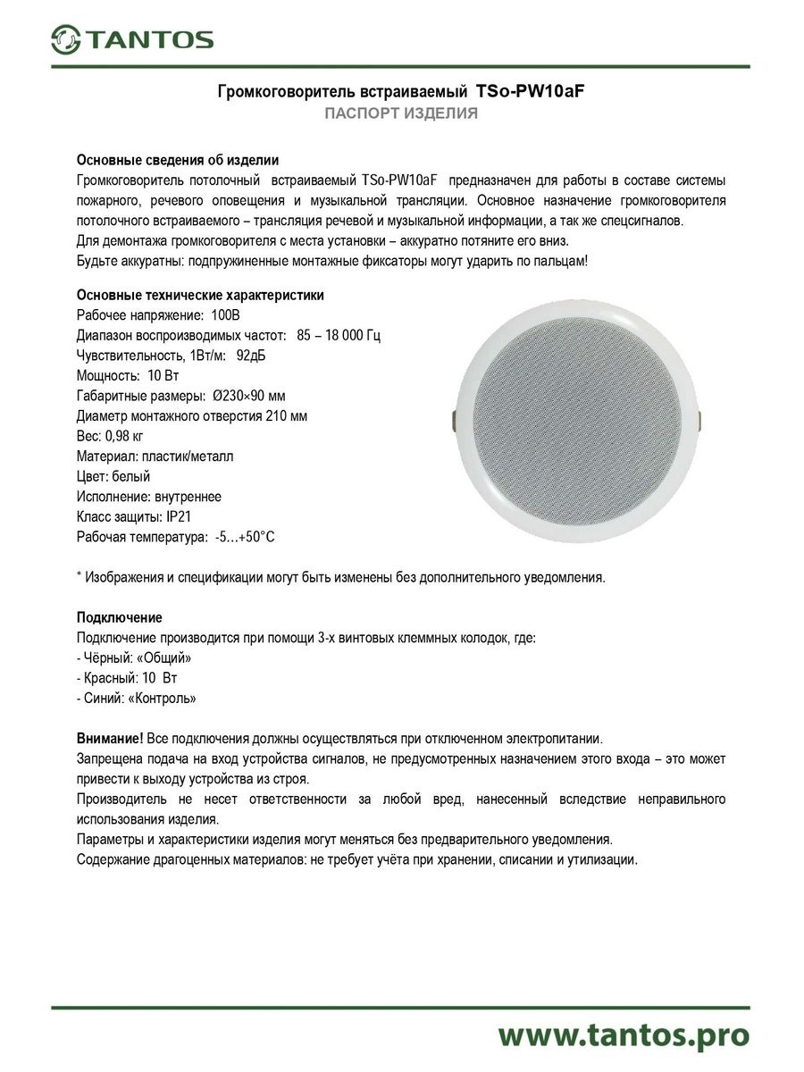 Оповещатель речевой со встроенным трансформатором. 100В, 10 Вт, 85-18000 Гц, 92дБ, Ø230х90 мм, 0.98кг, -5..+50С, IP21, потолочный. Функция контроля линий. Предназначен для работы в составе системы пожарного, речевого оповещения и музыкальной трансляции на базе моноблока TSo-M120F.