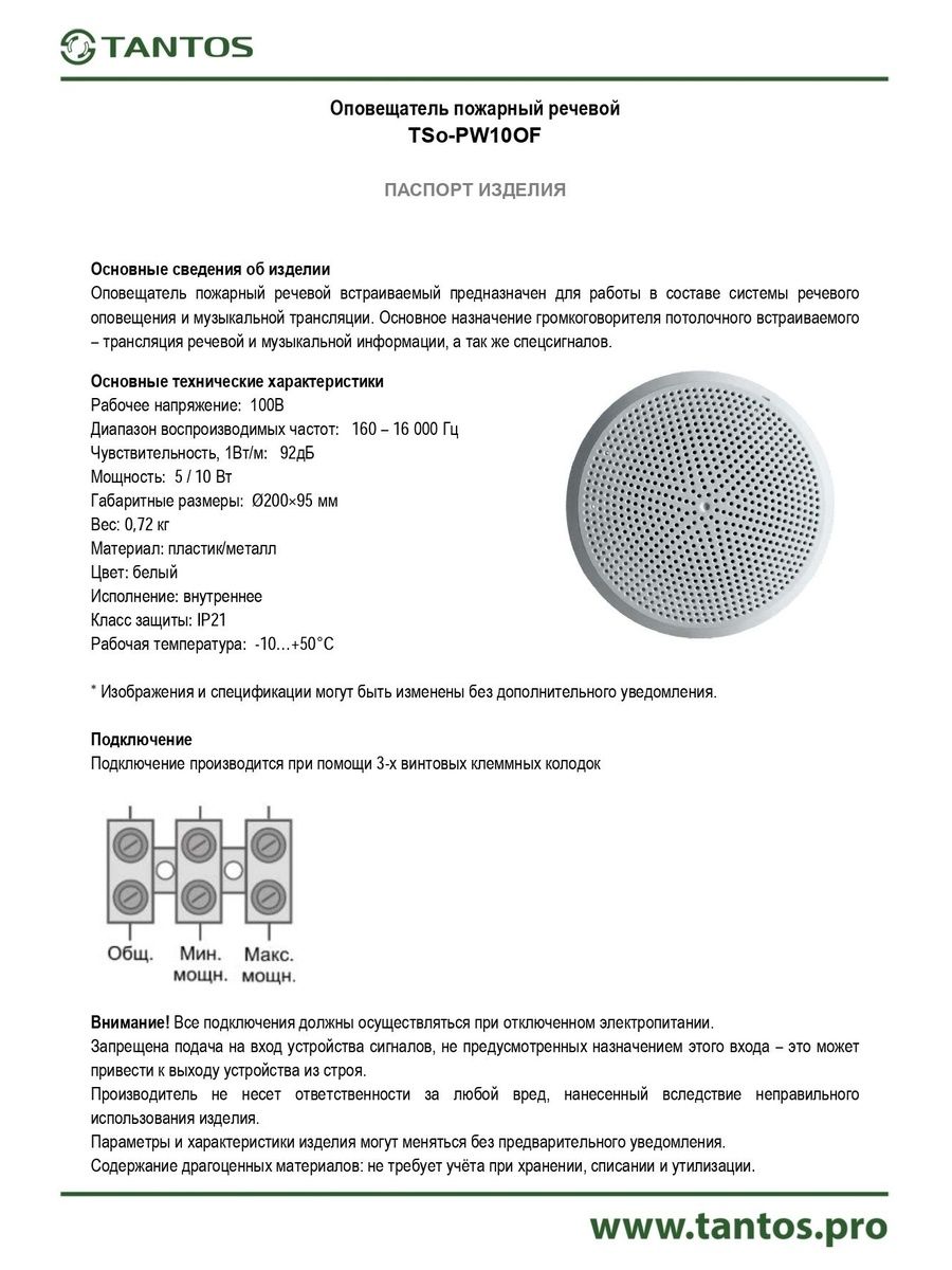 Оповещатель пожарный речевой со встроенным трансформатором. 100В, возможность выбора 5 Вт или 10 Вт, 160-16000 Гц, 102дБ, Ø200×95 мм, 0.72кг, -30..+55С, IP41. Функция контроля линий.