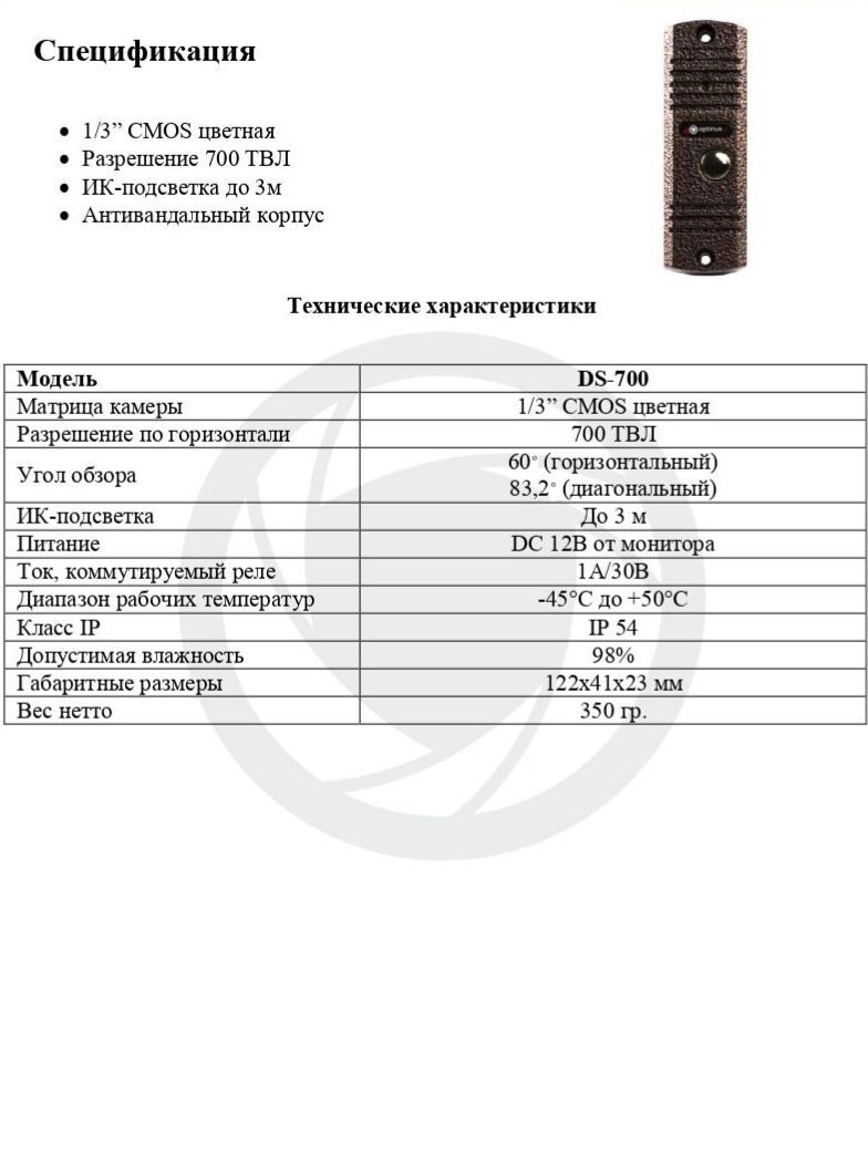 В вызывной панели встроена 1/3” CMOS цветная матрица с разрешением 700 ТВЛ, которая гарантирует Вам изображение отличного качества. Панель оснащена ИК-подсветкой дальностью до 3м, что позволит вести работу устройства при отсутствии освещения. Угол обзора камеры составляет 60° (горизонтальный) 83,2° (диагональный).