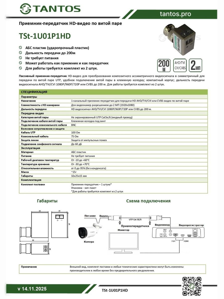 Пассивный приемник-передатчик HD-видео по витой паре. 1 канал BNC, витая пара под клеммы, компактный корпус; дальность передачи видеосигнала AHD/TVI/CVI 1080P/960P/720P до 200 м.
