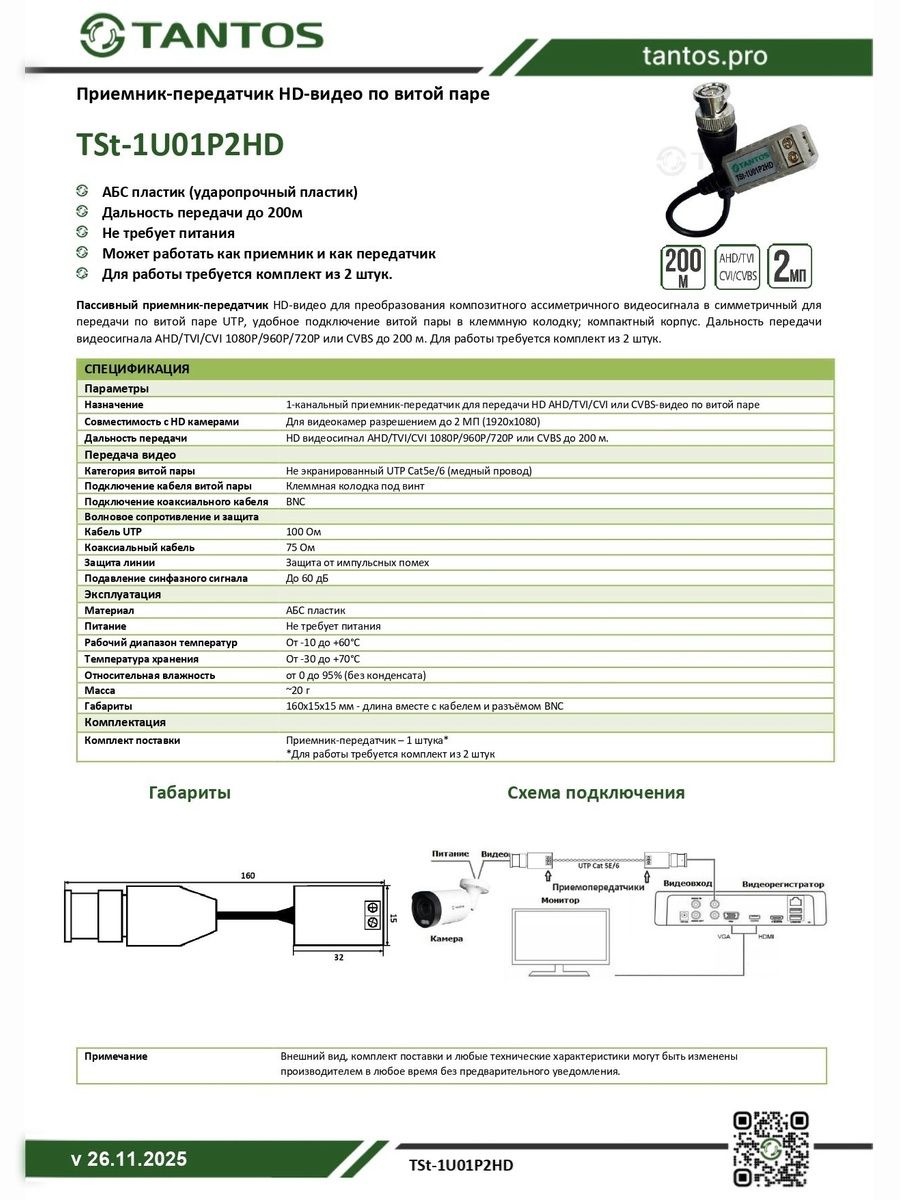 Пассивный приемник-передатчик HD-видео по витой паре.1 канал BNC, витая пара под клеммы, со шлейфом; дальность передачи видеосигнала AHD/TVI/CVI 1080P/960P/720P до 200 м.
