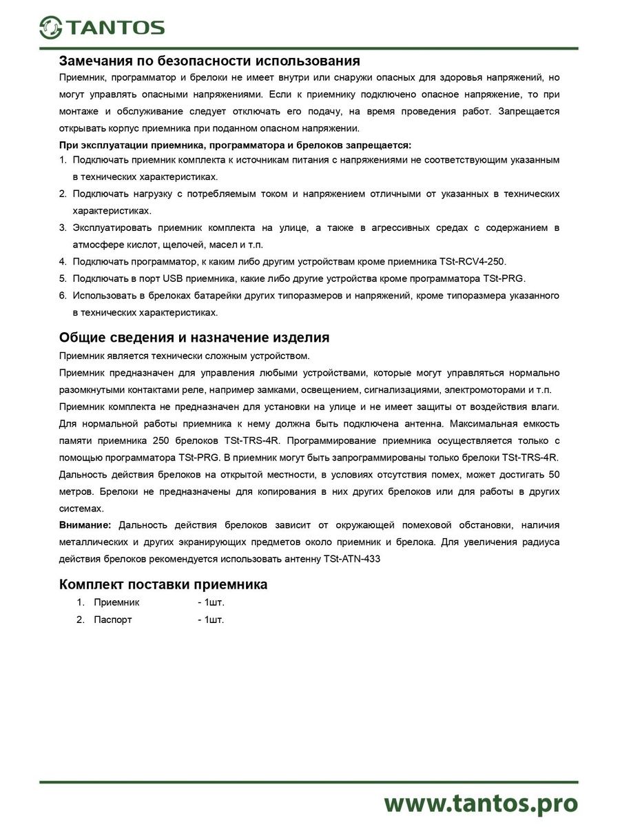 программируемый радиоприёмник сигналов от брелоков TSt-TRS-4R. Предназначен для дистанционного управления автоматическими шлагбаумами, воротами, калитками и т.п. Память приёмника рассчитана на 250 брелоков c возможностью их индивидуального удаления или добавления при помощи программатора TS-PRG, Увилечение дальности приёма радиосигнала возможно путём использования антенны TSt-ATN-433.