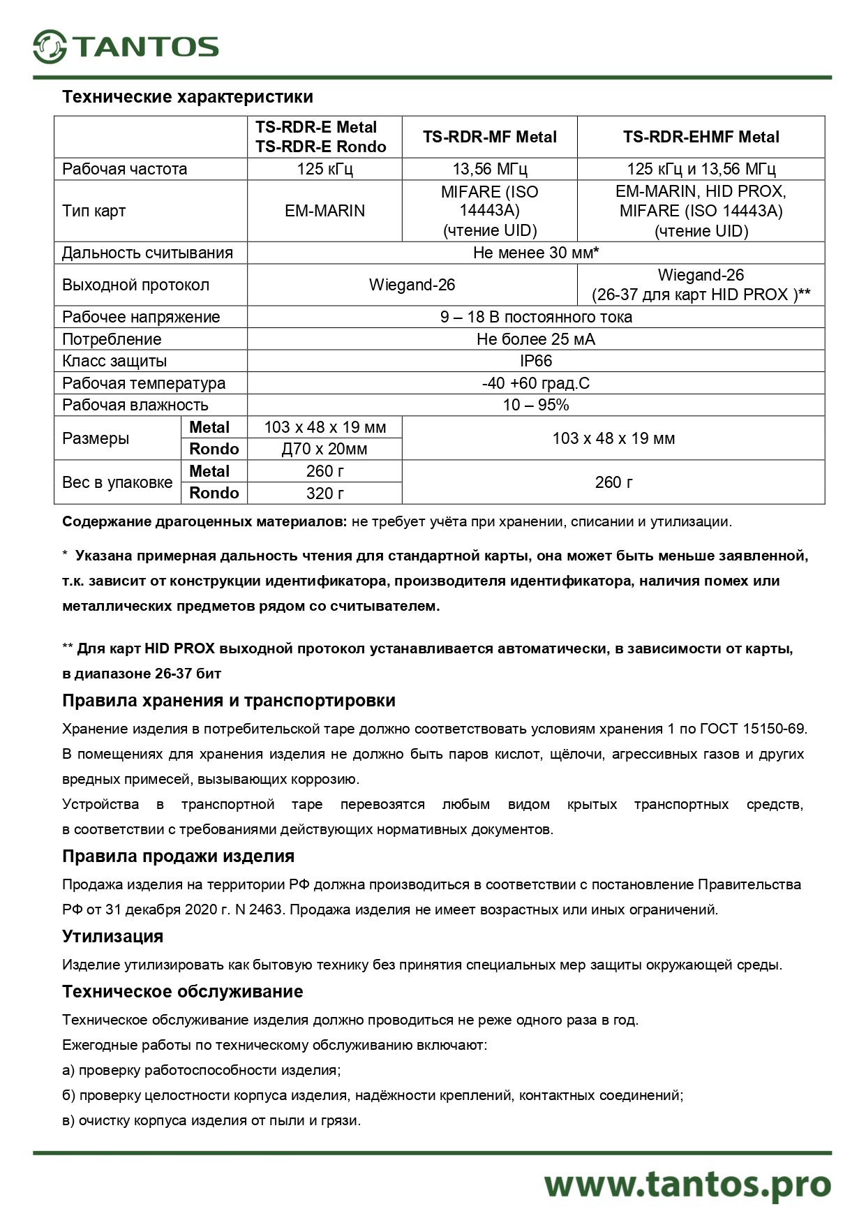 TS-RDR-E Metal (W-26) - уличный антивандальный бесконтактный считыватель карт формата EM-Marin (125кГц). Предназначен для работы в уличных условиях в составе систем контроля и управления доступом и совместим с любыми контроллерами, поддерживающими протокол Wiegand-26. Выполнен в компактном металлическом корпусе и имеет класс защиты IP66