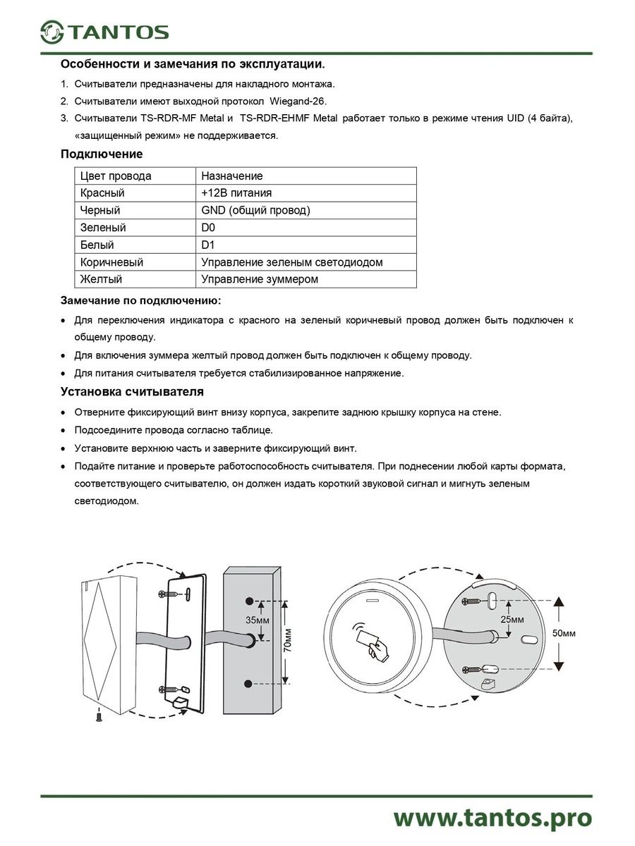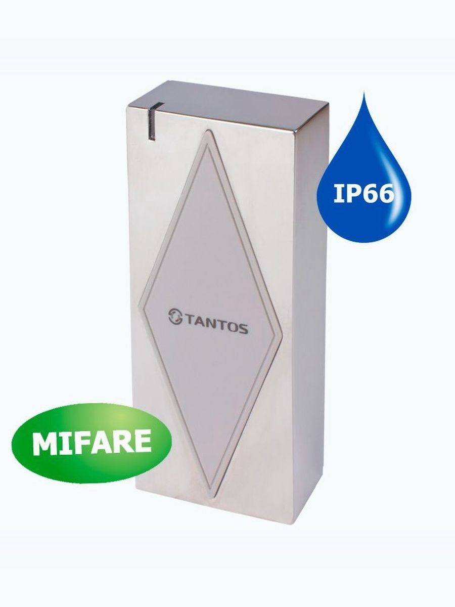 TANTOS TS-RDR-MF Metal - уличный антивандальный бесконтактный считыватель карт форматов Mifare (13,56МГц). Предназначен для работы в уличных условиях в составе систем контроля и управления доступом и совместим с любыми контроллерами, поддерживающими протокол Wiegand. Выполнен в компактном металлическом корпусе и имеет класс защиты IP66.