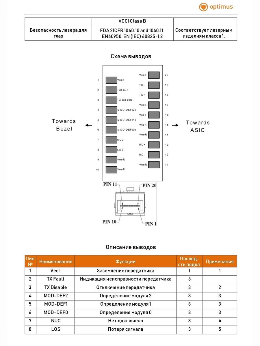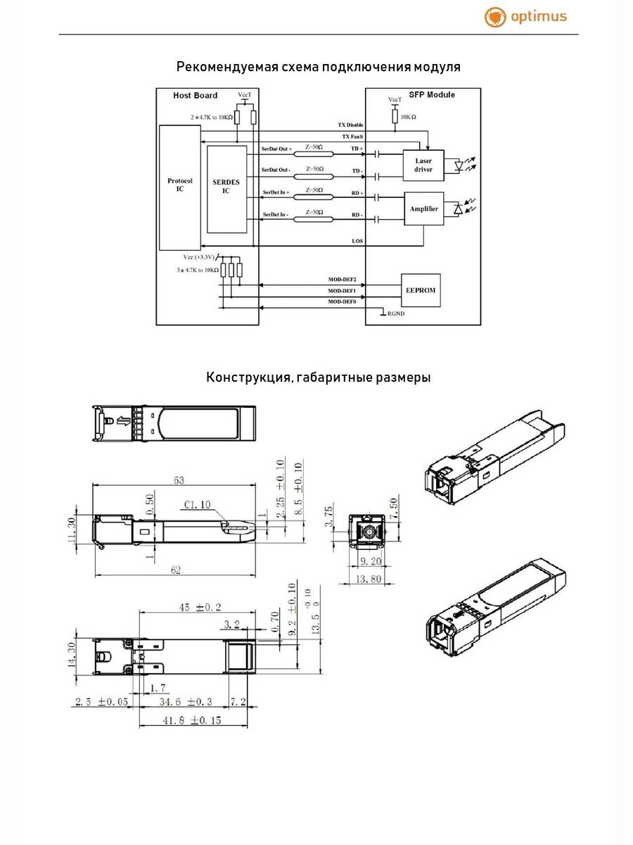 Модуль выполнен в форм-факторе SFP с разъёмом SC. Поддерживает функцию DDM для мониторинга температуры, тока лазера, выходной и входной оптической мощности, напряжения питания. Рабочая температура модуля от 0 до 70 °C, температура окружающей среды от 0 до 45 °C.