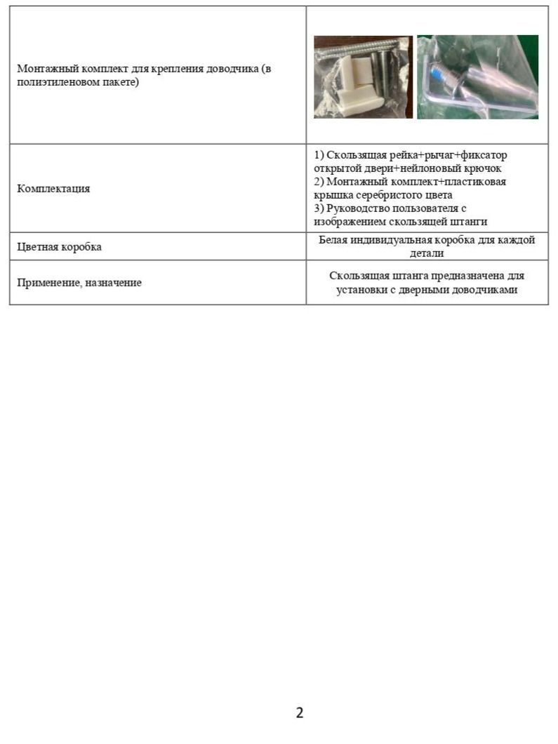 Комплектация 1) Скользящая рейка+рычаг+фиксатор открытой двери+нейлоновый крючок 2) Монтажный комплект+пластиковая крышка серебристого цвета 3) Руководство пользователя с изображением скользящей штанги