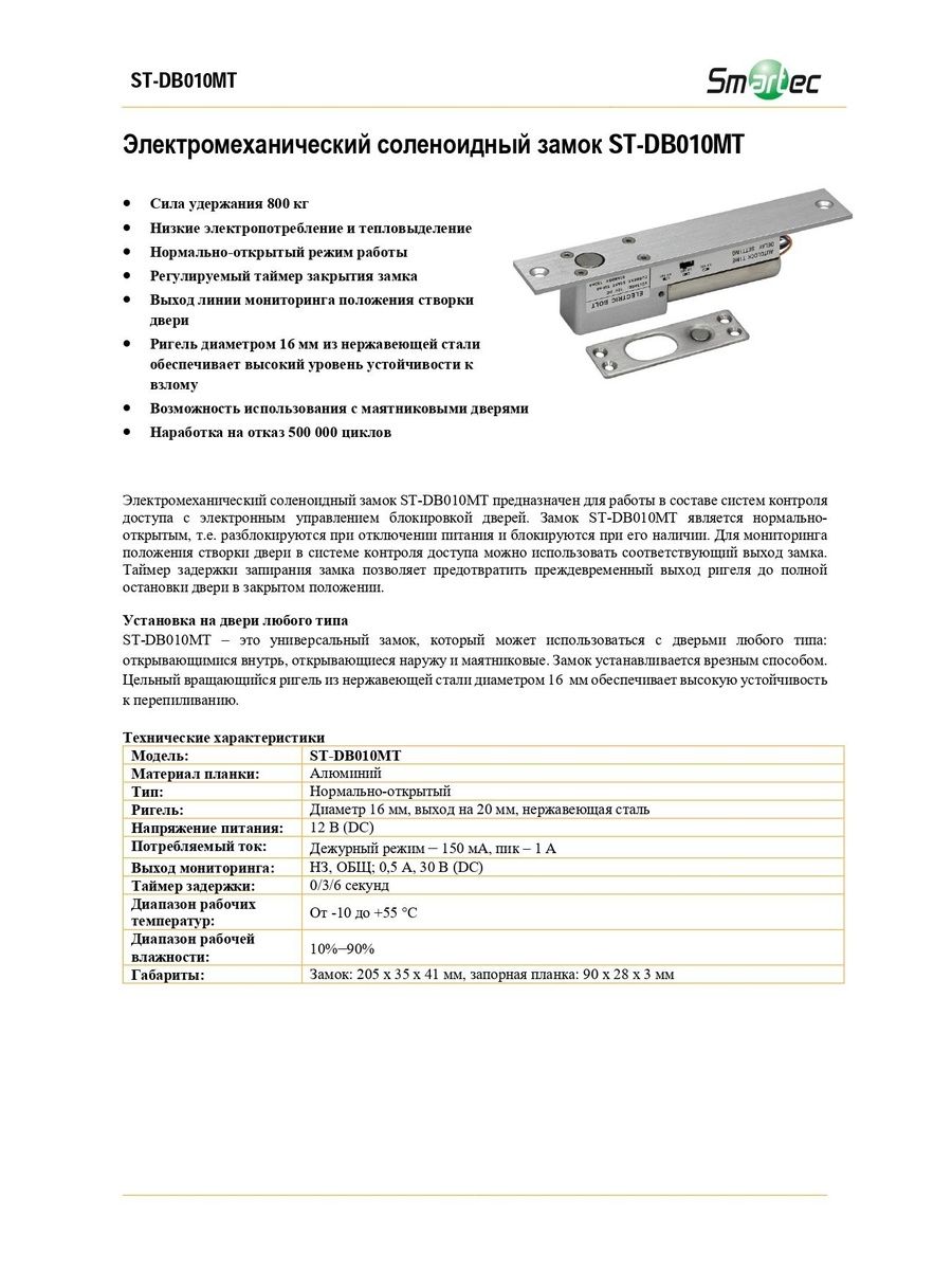 Электромеханический соленоидный замок ST-DB010MT предназначен для работы в составе систем контроля доступа с электронным управлением блокировкой дверей. Замок ST-DB010MT является нормально-открытым, т.е. разблокируются при отключении питания и блокируются при его наличии. Для мониторинга положения створки двери в системе контроля доступа можно использовать соответствующий выход замка. Таймер задержки запирания замка позволяет предотвратить преждевременный выход ригеля до полной остановки двери в закрытом положении.