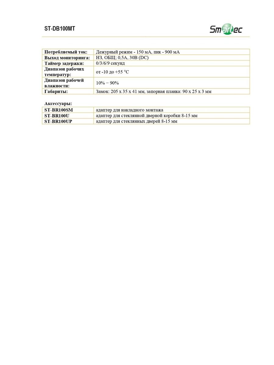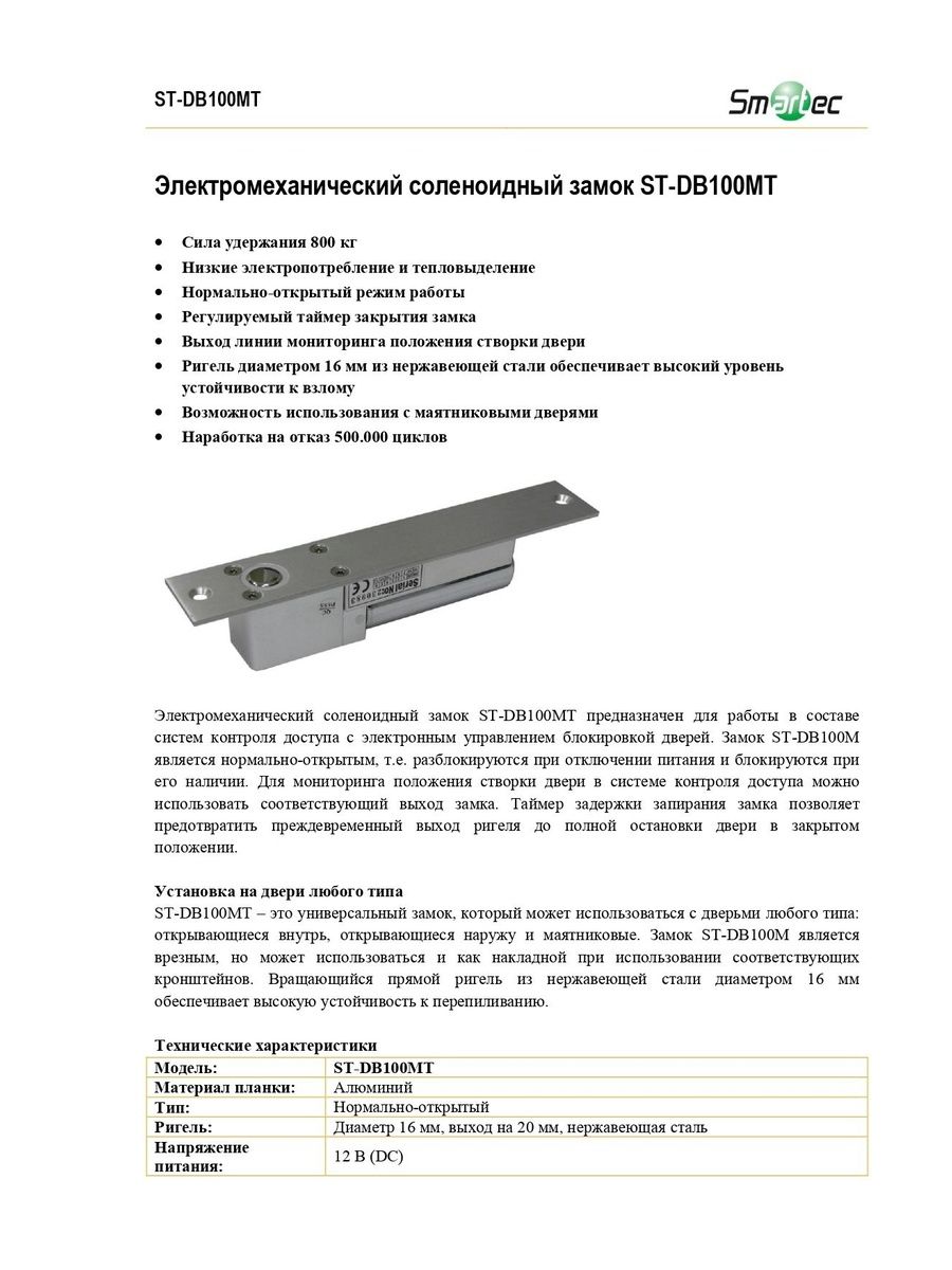 Нормально-открытый соленоидный замок ST-DB100MT предназначен для работы в составе систем контроля доступа с электронным управлением блокировкой дверей и имеет силу удержания 800 кг.