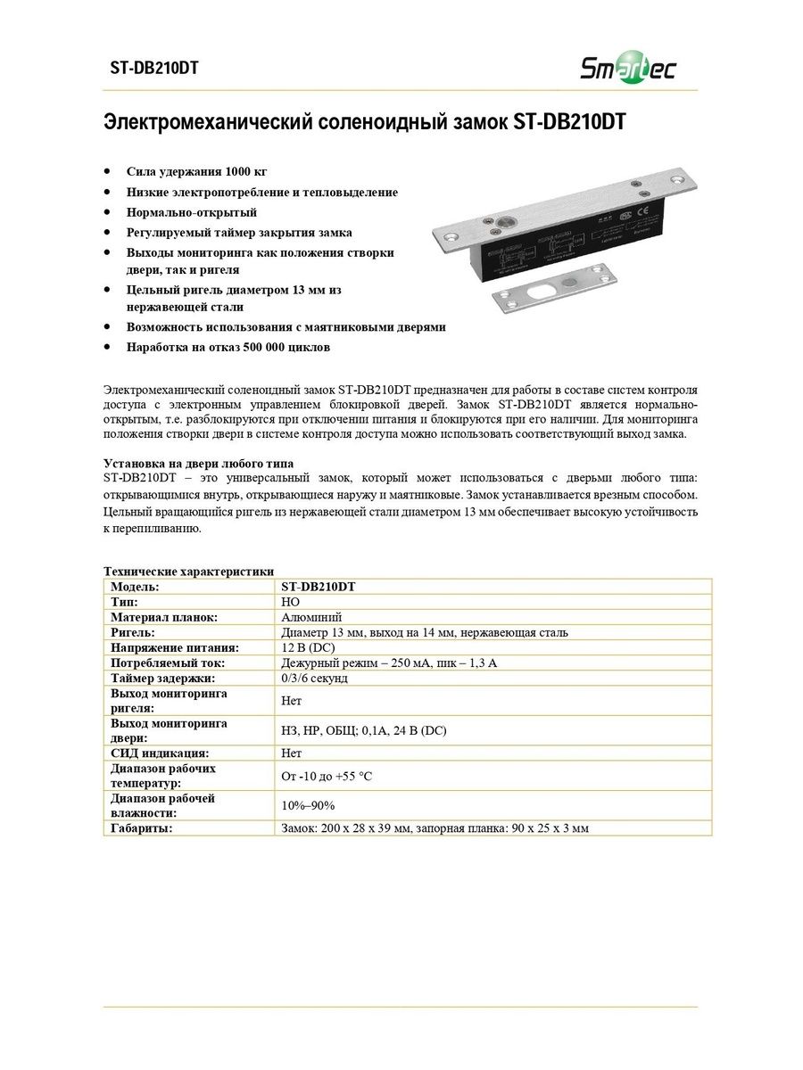 Электромеханический соленоидный замок ST-DB210DT предназначен для работы в составе систем контроля доступа с электронным управлением блокировкой дверей. Замок ST-DB210DT является нормально-открытым, т.е. разблокируются при отключении питания и блокируются при его наличии. Для мониторинга положения створки двери в системе контроля доступа можно использовать соответствующий выход замка.