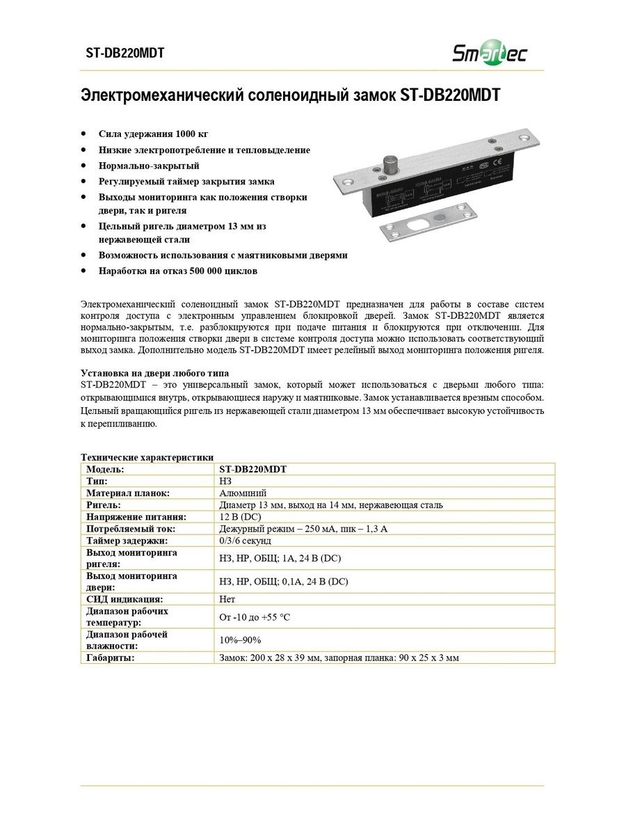 Врезные электромеханические соленоидные замки ST-DB220MDT с силой удержания 1000 кг можно устанавливать как на легкие, так и на тяжелые правые/левые/маятниковые двери. Устройства оснащены цельным вращающимся ригелем из нержавеющей стали, устойчивым к перепиливанию. Для контроля положения дверного полотна и ригеля предусмотрены соответствующие релейные выходы, а для предотвращения преждевременного запирания – таймер задержки выхода ригеля. Данные замки нормально-закрытого (НЗ) типа ST-DB220MDT сохраняют помещение закрытым при отсутствии напряжения, а расчетная наработка на отказ до 500 000 циклов обеспечивает долговечность даже в местах с высокой проходимостью.