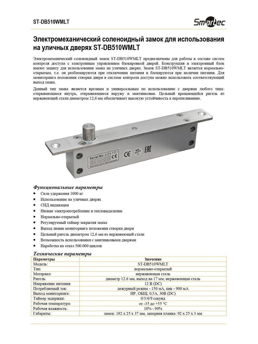 Нормально-открытый соленоидный замок ST-DB510WMLT предназначен для работы в составе систем контроля доступа с электронным управлением блокировкой дверей и имеет силу удержания 1000 кг.
