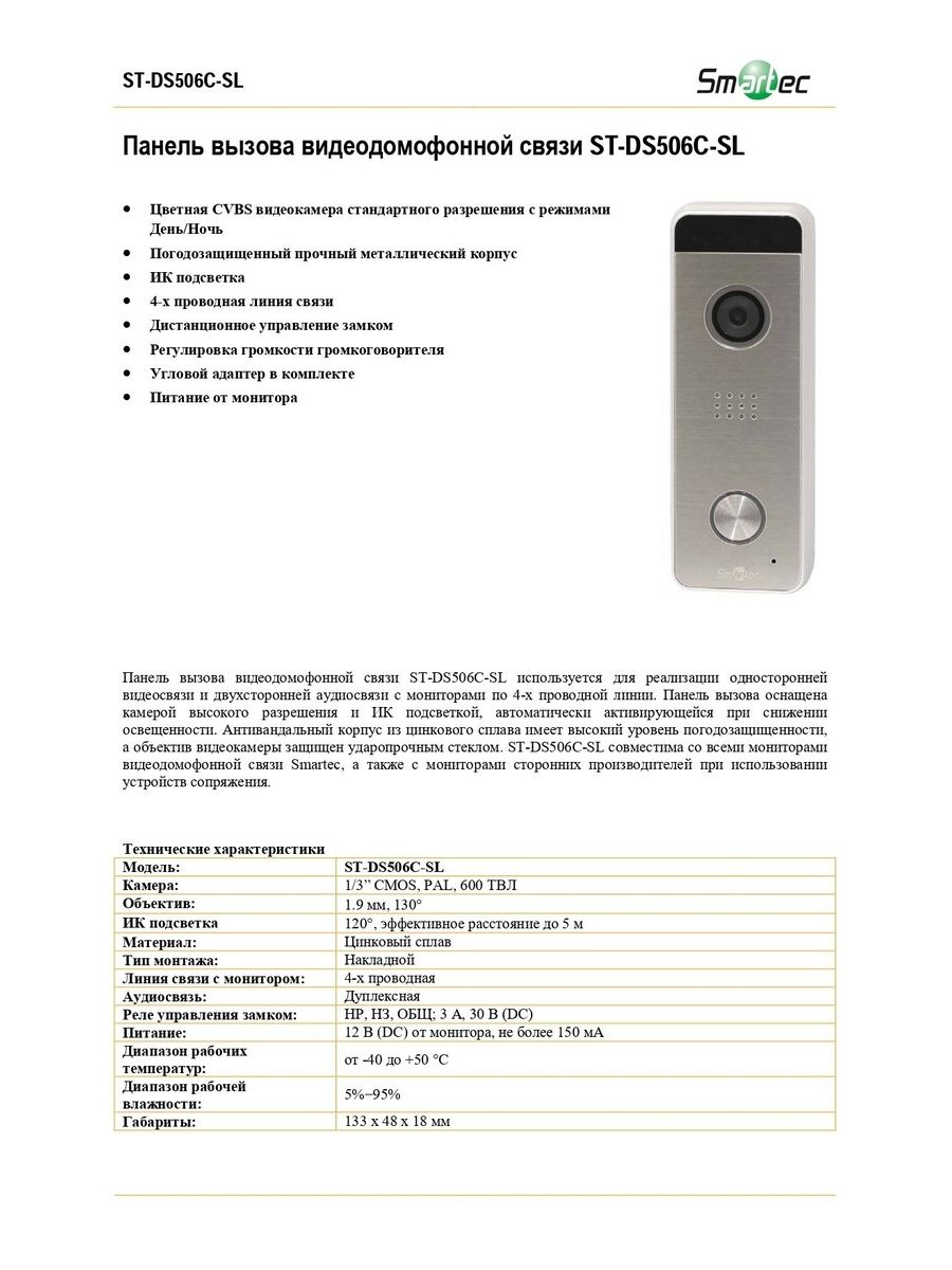 Бюджетная вызывная панель видеодомофона ST-DS506C-SL используется для реализации односторонней видеосвязи и двухсторонней аудиосвязи с мониторами по 4-х проводной линии. При этом она совместима с мониторами не только марки Smartec, но и сторонних производителей – при использовании устройств сопряжения. Модель ST-DS506C-SL оснащена камерой высокого разрешения и ИК подсветкой, автоматически активирующейся при снижении освещенности. Ее антивандальный корпус из цинкового сплава имеет высокий уровень погодозащищенности, а объектив видеокамеры защищен ударопрочным стеклом. Кроме того, благодаря встроенным контактам, эта вызывная панель обеспечивает дистанционное управление работой электрозамка или электрозащелки НО или НЗ типа.