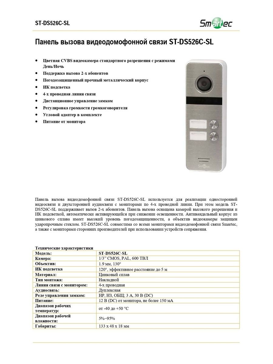 Благодаря наличию 2 кнопок вызова, панель ST-DS526C-SL обеспечивает связь с 2-мя абонентами, что актуально как для офисных, так и жилых помещений. При этом она совместима с мониторами не только марки Smartec, но и сторонних производителей – для этого необходимы устройства сопряжения. За счет встроенных контактов ST-DS526C-SL позволяет дистанционно управлять работой электрозамка или электрозащелки НО или НЗ типа. Эта вызывная панель на 2 абонента оснащена камерой высокого разрешения, защищенной ударопрочным стеклом, и ИК подсветкой, которая автоматически активируетсяя при снижении освещенности. Кроме того, корпус из цинкового сплава гарантирует вызывной панели высокий уровень защиты от вандалов и неблагоприятных условий окружающей среды.
