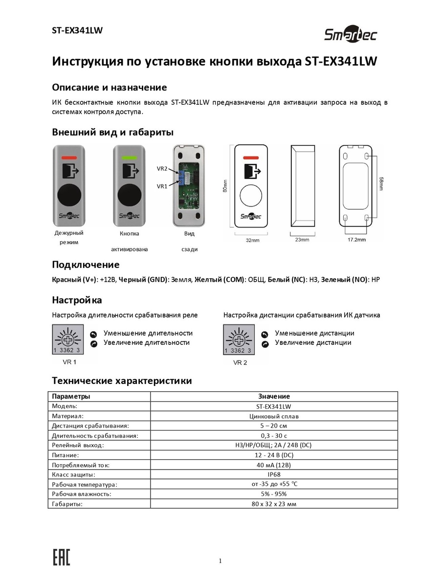 ST-EX341LW – ИК кнопка выхода, обеспечивающая бесконтактное срабатывание на расстоянии 5–20 см, что помогает противостоять распространению вирусных заболеваний на объекте. За счет отсутствия подвижных частей устройство выдерживает до 1 000 000 циклов срабатывания, а широкий диапазон рабочих температур и защита корпуса по IP68 позволяют устанавливать ST-EX341LW как в помещениях (в том числе, производственных), так и на улице. Кроме того, наличие у кнопки НЗ и НР контактов позволяет без проблем включить ее в любую СКУД, а накладной способ монтажа – избежать дополнительного штробления стен.