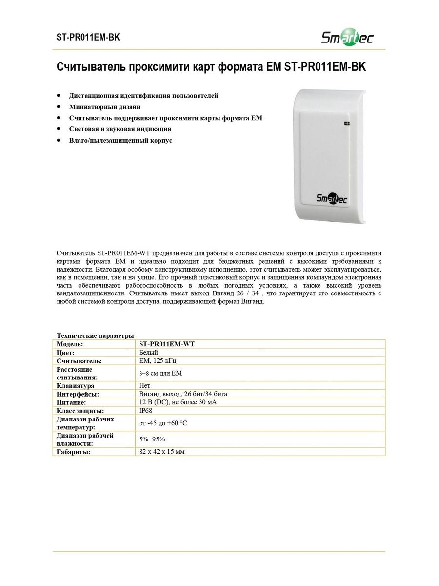 Считыватель ST-PR011EM-BK предназначен для работы в составе системы контроля доступа с проксимити картами формата EM и идеально подходит для бюджетных решений с высокими требованиями к надежности.