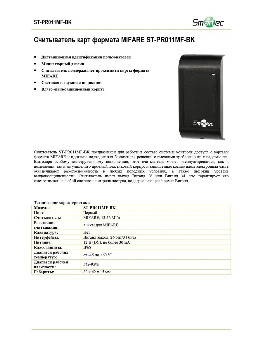 Бесконтактный считыватель ST-PR011MF-BK предназначен для работы в составе бюджетных СКУД со смарт-картами стандарта MIFARE, которые он распознает на расстоянии 3–8 см. Основная особенность таких идентификаторов – более высокая степень защиты информации по сравнению, например, с ЕМ-устройствами. Наличие выхода Виганд 26 или Виганд 34 (по выбору заказчика) гарантирует совместимость ST-PR011MF-BK с любым контроллером СКУД, поддерживающим формат Виганд. Кроме того, благодаря залитой компаундом электронике и прочному корпусу со степенью защиты IP68, этот считыватель MIFARE может работать в любых погодных условиях, а также имеет высокий уровень вандалозащищенности.