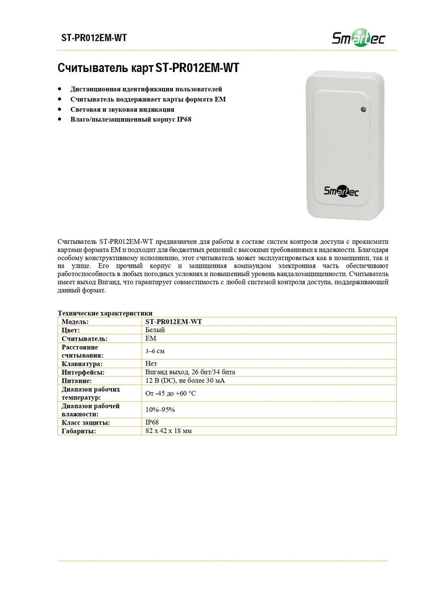 Считыватель ST-PR012EM-WT предназначен для работы в составе систем контроля доступа с прокисмити картами формата EM и подходит для бюджетных решений с высокими требованиями к надежности. Благодаря особому конструктивному исполнению, этот считыватель может эксплуатироваться как в помещении, так и на улице.