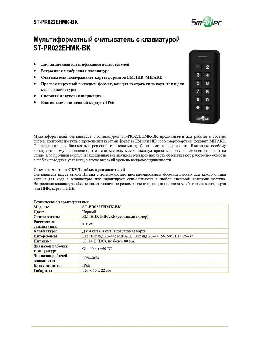 ST-PR022EHMK-BK – мультиформатный считыватель, поддерживающий сразу две частоты идентификации: проксимити – 125 кГц (карты Em Marin и HID) и смарт – 13,56 МГц (карты Mifare). Благодаря 12-кнопочной мембранной клавиатуре устройство может работать в различных режимах идентификации: только карта, карта или ПИН, карта и ПИН. При этом считыватель с клавиатурой безотказно функционирует в любых погодных условиях, прочный корпус гарантирует качественную защиту от вандалов, а светозвуковая индикация состояния обеспечивает дополнительное удобство его использования.