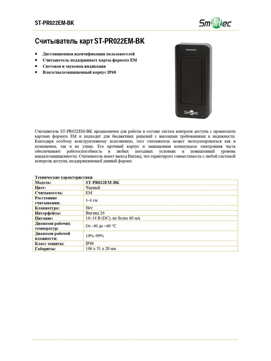 Считыватель ST-PR022EM-BK предназначен для работы в составе систем контроля доступа с прокисмити картами формата EM и подходит для бюджетных решений с высокими требованиями к надежности.