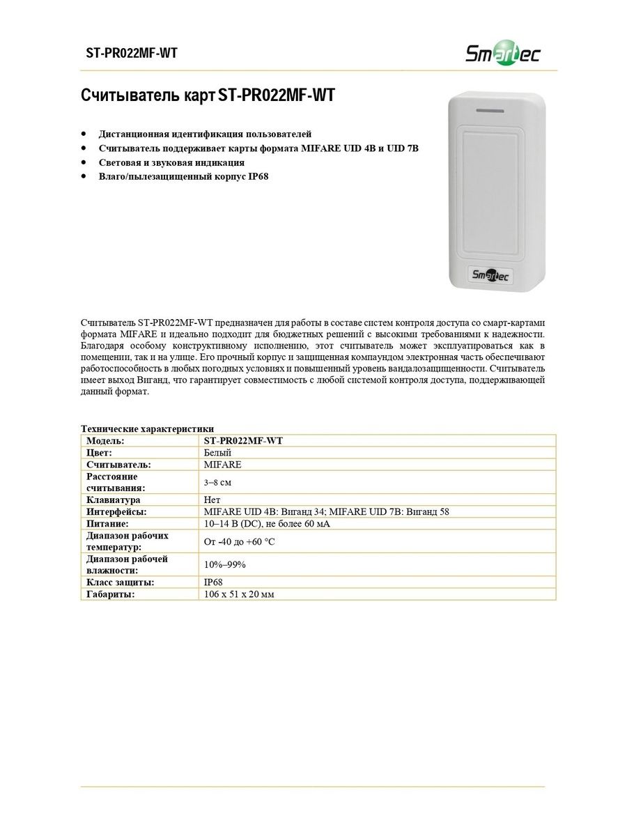 ST-PR022MF-WT предназначен для работы в составе систем контроля доступа со смарт-картами формата MIFARE, которые считывает на расстоянии 3–8 см, и идеально подходит для бюджетных решений с высокими требованиями к надежности. Этот бесконтактный считыватель имеет выход Виганд 34/58, что гарантирует совместимость с любой системой контроля доступа, поддерживающей данный формат. Благодаря особому конструктивному исполнению, этот считыватель может эксплуатироваться как в помещении, так и на улице. Его прочный корпус и защищенная компаундом электронная часть обеспечивают работоспособность в любых погодных условиях и повышенный уровень вандалозащищенности.