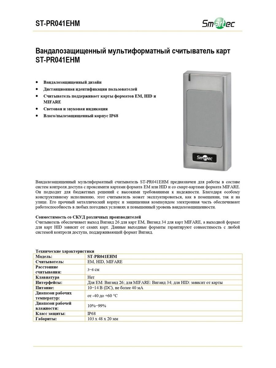 Вандалозащищенный мультиформатный считыватель ST-PR041EHM предназначен для работы в составе систем контроля доступа с проксимити картами формата EM или HID и со смарт-картами формата MIFARE. Он подходит для бюджетных решений с высокими требованиями к надежности и может эксплуатироваться, как в помещении, так и на улице.
