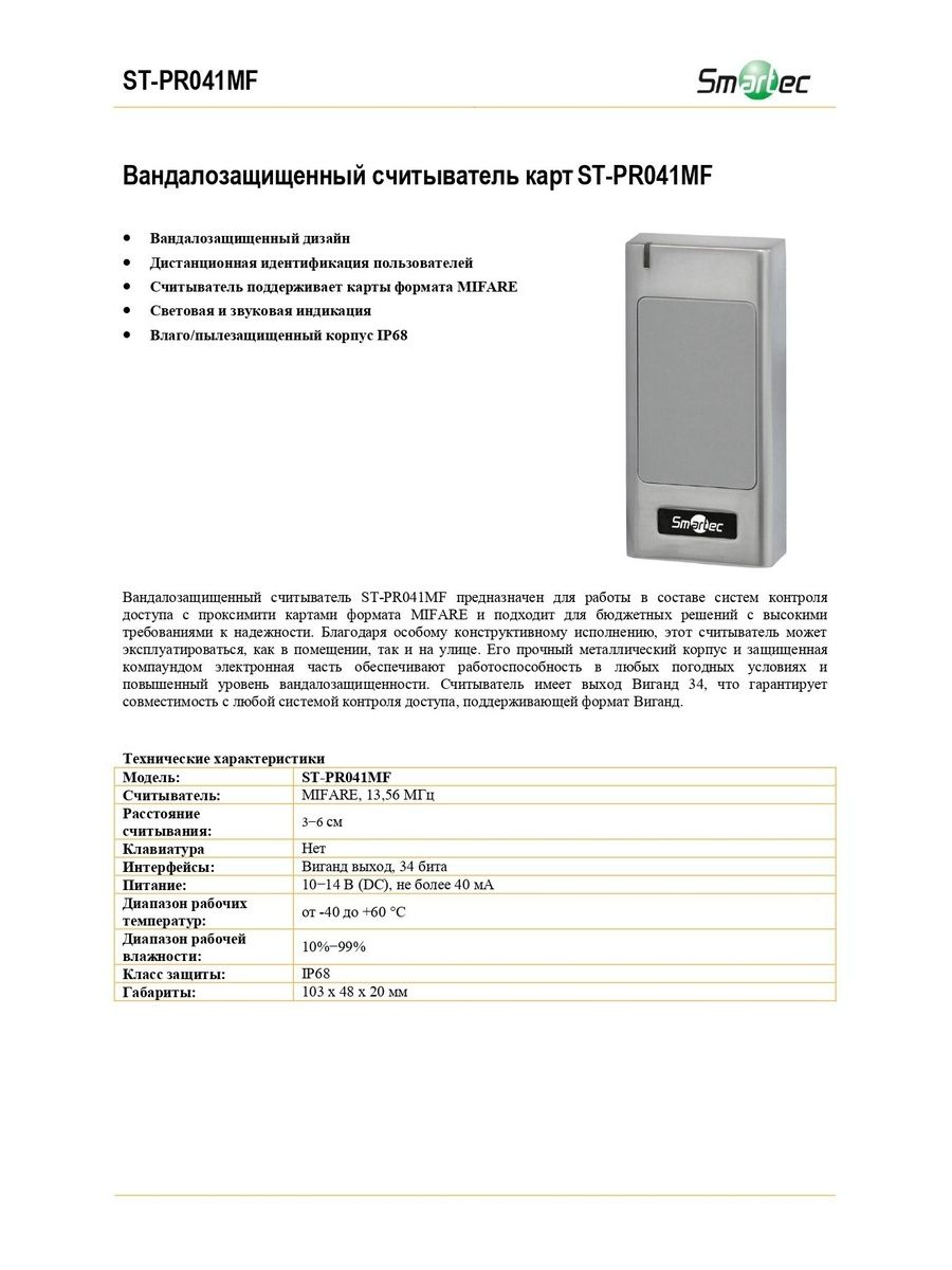 Вандалозащищенный считыватель ST-PR041MF предназначен для работы в составе систем контроля доступа с проксимити картами формата MIFARE и подходит для бюджетных решений с высокими требованиями к надежности. Считыватель может эксплуатироваться, как в помещении, так и на улице.