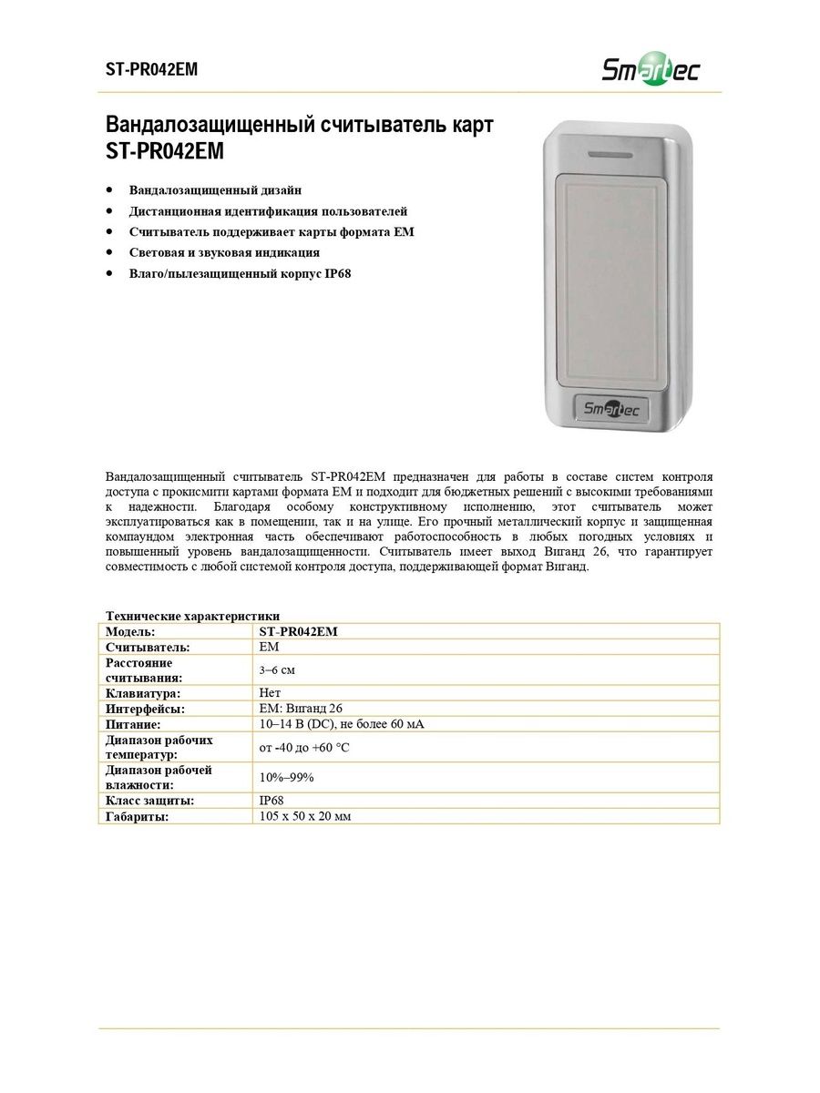 Вандалозащищенный считыватель ST-PR042EM предназначен для работы в составе систем контроля доступа с прокисмити картами формата EM и подходит для бюджетных решений с высокими требованиями к надежности. Считыватель может эксплуатироваться как в помещении, так и на улице.