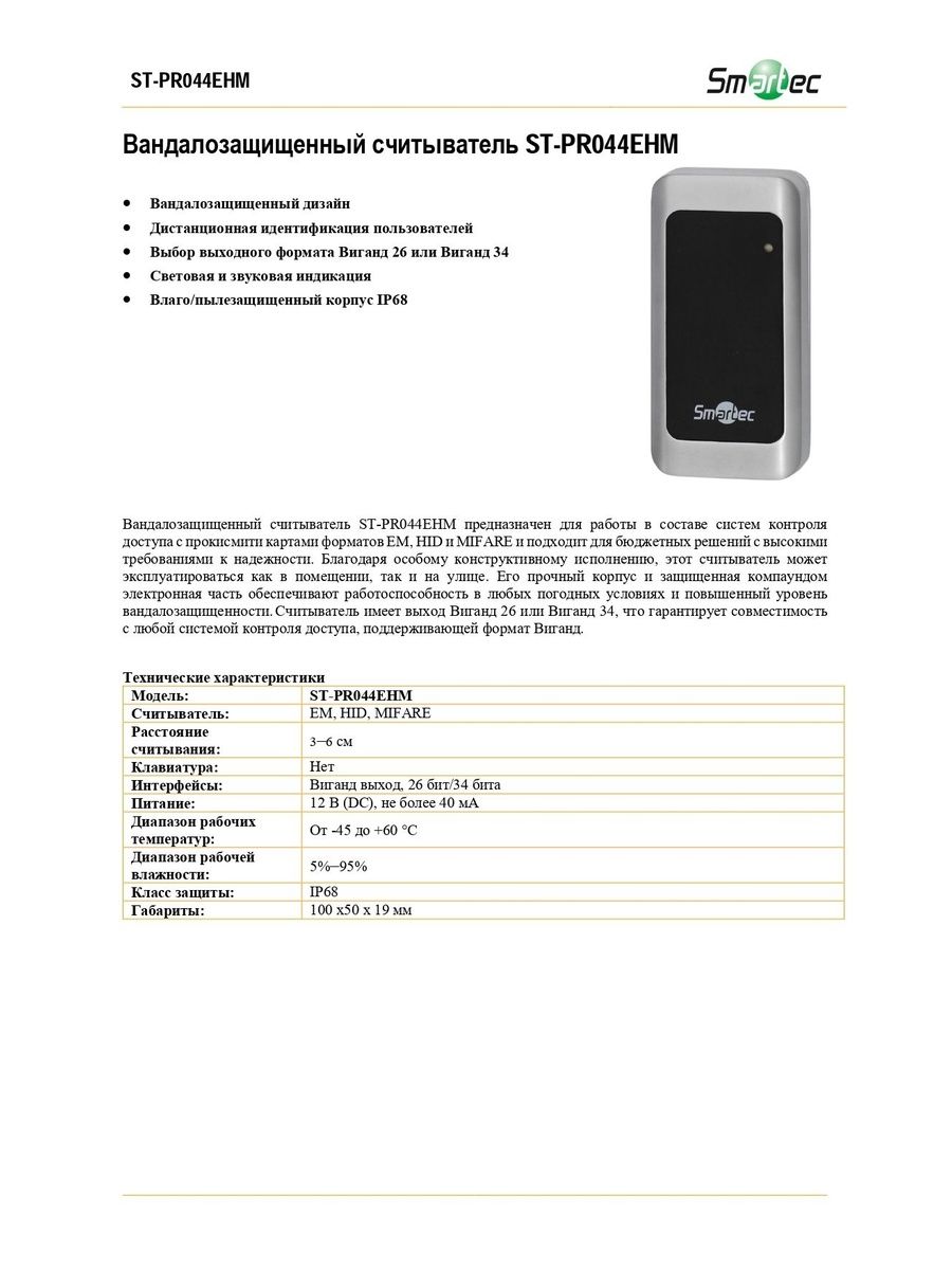 Вандалозащищенный считыватель ST-PR044EHM предназначен для работы в составе систем контроля доступа с прокисмити картами форматов EM, HID и MIFARE и подходит для бюджетных решений с высокими требованиями к надежности. Благодаря особому конструктивному исполнению, этот считыватель может эксплуатироваться как в помещении, так и на улице. Его прочный корпус и защищенная компаундом электронная часть обеспечивают работоспособность в любых погодных условиях и повышенный уровень вандалозащищенности. Считыватель имеет выход Виганд 26 или Виганд 34, что гарантирует совместимость с любой системой контроля доступа, поддерживающей формат Виганд.