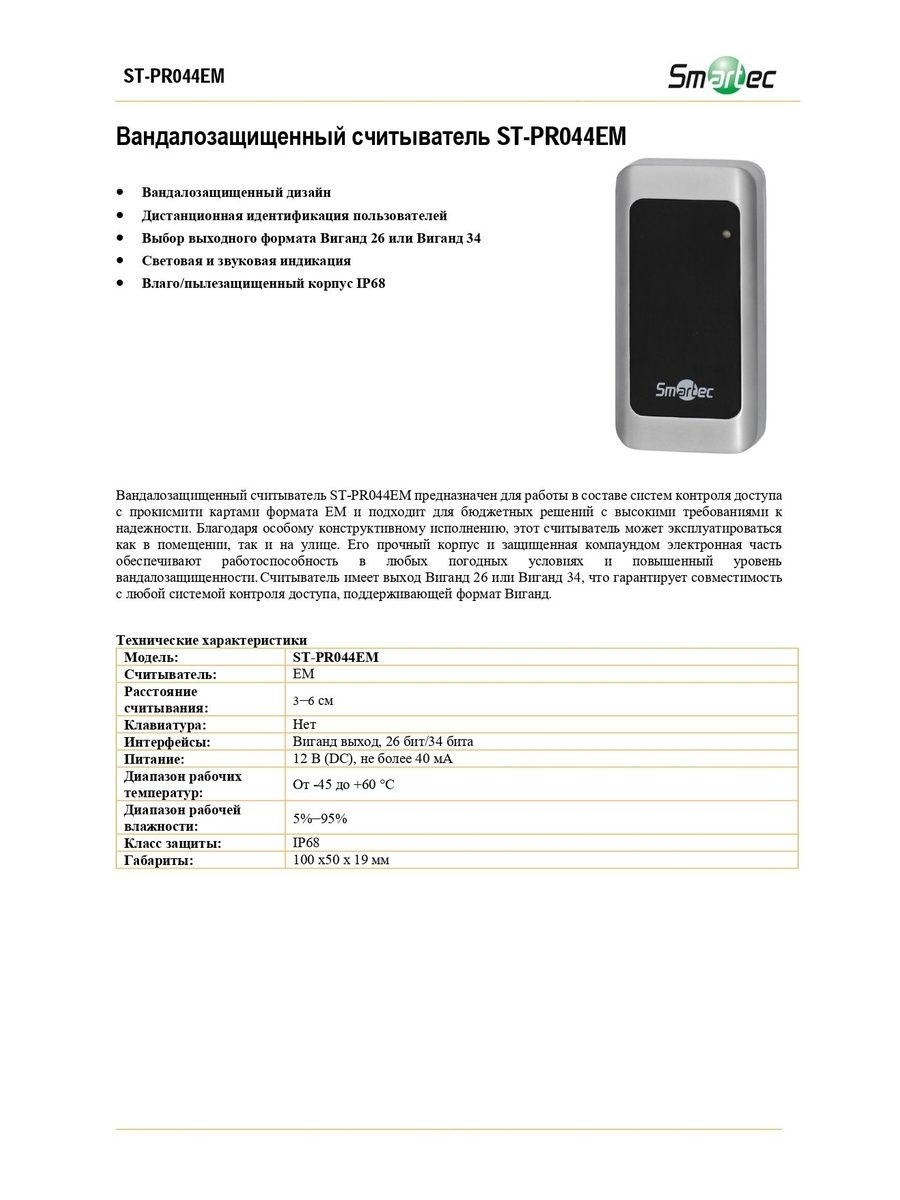 Проксимити считыватель ST-PR044EM работает на частоте 125 кГц, распознает карты распространенного стандарта Em Marine (EM) на расстоянии до 6 см и предназначен для бюджетных СКУД с высокими требованиями к надежности. Этот считыватель Em Marine имеет высокий уровень вандалозащищенности и может функционировать в различных погодных условиях (IP68), миниатюрный корпус обеспечивает монтаж в любом удобном месте рядом с дверью, а светозвуковая индикация – дополнительное удобство при использовании. Кроме того, наличие у карт-ридера выхода Виганд 26 или Виганд 34 (по выбору заказчика) гарантирует совместимость устройства с любой СКУД, поддерживающей формат Виганд.