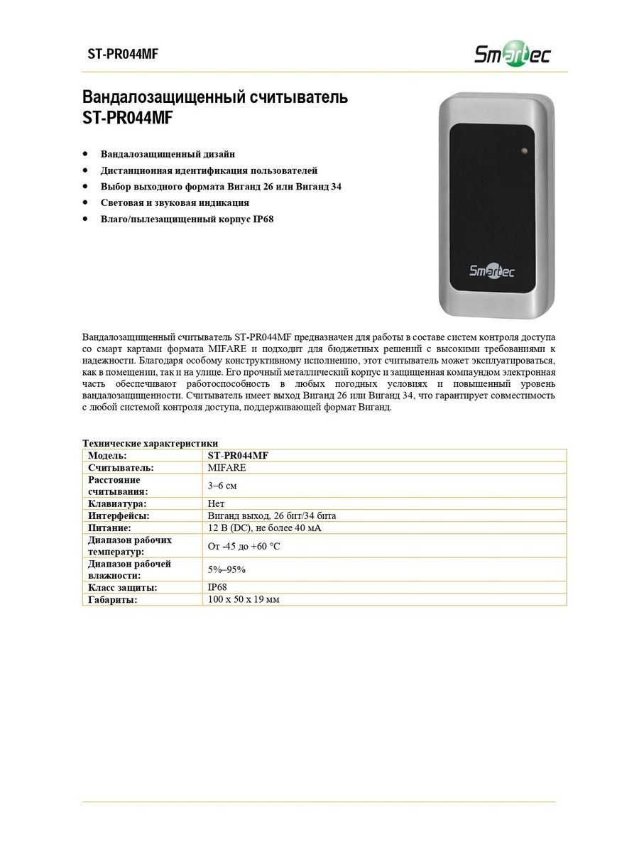 ST-PR044MF – считыватель карт Mifare, включает в себя все преимущества данной технологии и подходит для бюджетных решений с высокими требованиями к надежности. Он обеспечивает дистанционное считывание на расстоянии 3–6 см, имеет вандалозащищённый металлический корпус с уровнем защиты IP68, световую и звуковую индикацию, а также интерфейс Wiegand 26/34, что гарантирует надежную работу в различных СКУД. Такой считыватель обеспечивает высокий уровень безопасности благодаря поддержке криптографической защиты данных, превосходя тем самым более простые устройства на базе технологии EM Marinе.
