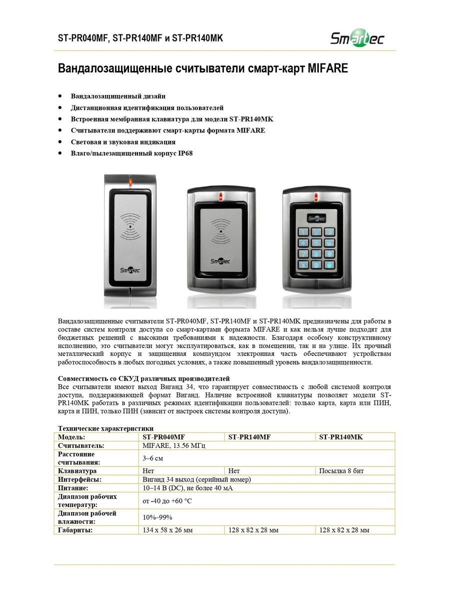 Вандалозащищенный считыватель ST-PR140MF предназначен для работы в составе систем контроля доступа со смарт-картами формата MIFARE и идеально подходит для бюджетных решений с высокими требованиями к надежности. Считыватель имеет конструкцию для установки, как в помещении, так и на улице.