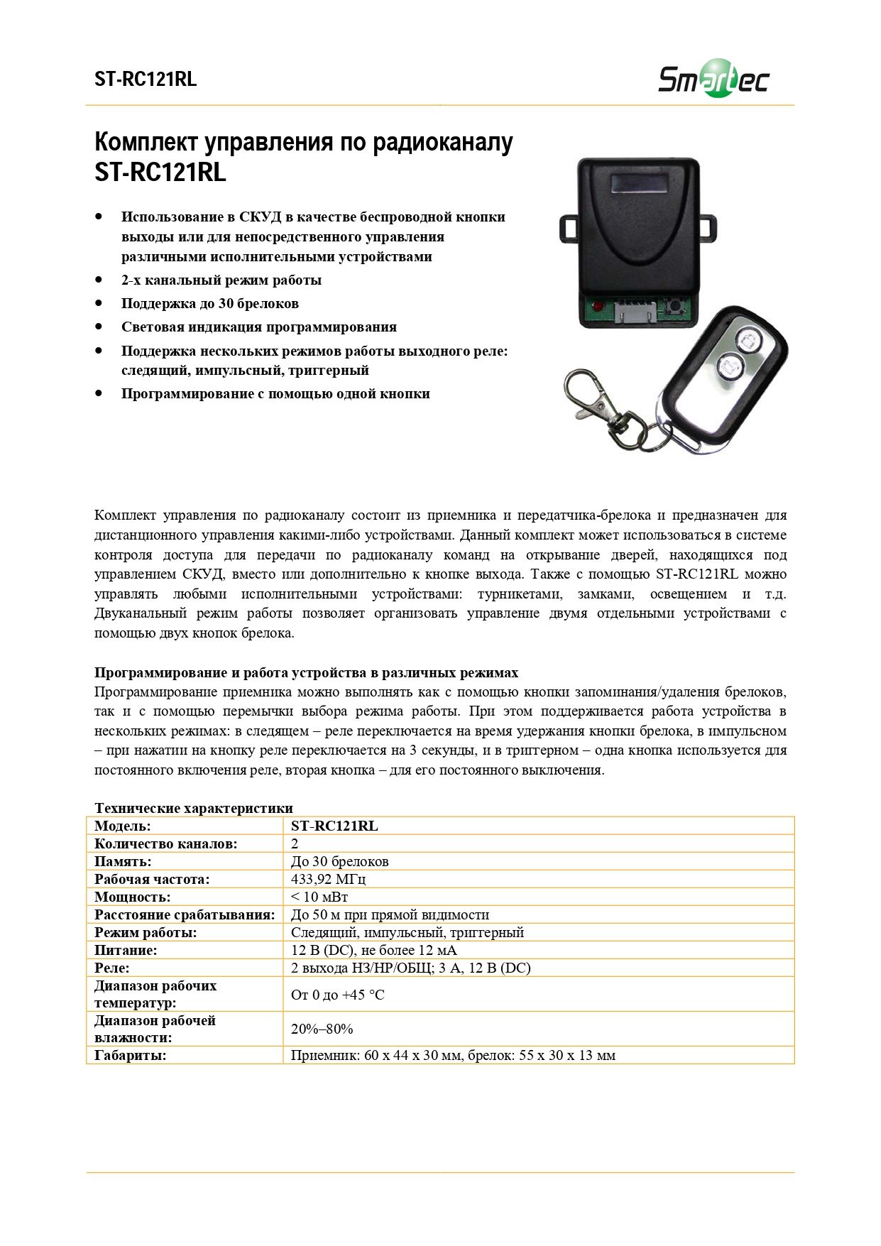 Комплект управления по радиоканалу состоит из приемника и передатчика-брелока и предназначен для дистанционного управления какими-либо устройствами. Данный комплект может использоваться в системе контроля доступа для передачи по радиоканалу команд на открывание дверей, находящихся под управлением СКУД, вместо или дополнительно к кнопке выхода. Также с помощью ST-RC121RL можно управлять любыми исполнительными устройствами: турникетами, замками, освещением и т.д. Двуканальный режим работы позволяет организовать управление двумя отдельными устройствами с помощью двух кнопок брелока.