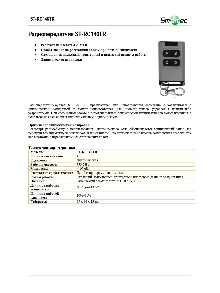 Радиопередатчик-брелок ST-RC126TR предназначен для использования совместно с комплектами с динамической кодировкой и может использоваться для дистанционного управления какими-либо устройствами. При совместной работе с одноканальными приемниками кнопки каналов могут независимо использоваться со своими индивидуальными приемниками.