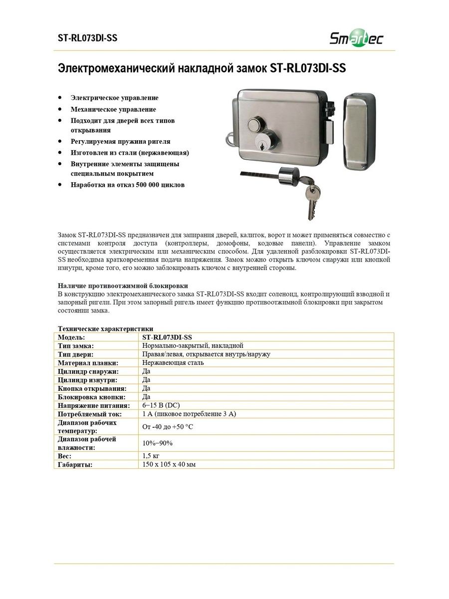 Замок ST-RL073DI-SS предназначен для запирания дверей, калиток или ворот, при этом управление замком осуществляется, либо электрическим, либо механическим способом.