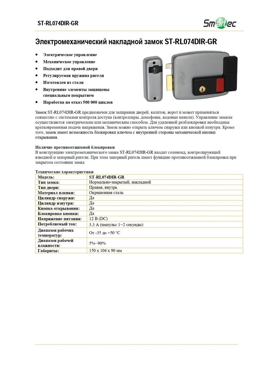 ST-RL074DIR-GR – замок электромеханический накладной, предназначен для запирания дверей, калиток или ворот правостороннего открывания, имеет прочный корпус из окрашенной стали и широкий диапазон рабочих температур. Управление устройством осуществляется двумя способами: с помощью механического цилиндра, ключа и встроенной кнопки разблокировки (с возможностью блокировки) или посредством оборудования СКУД. За счет того, что замок ST-RL074DIR-GR относится к типу нормально-закрытых, при возможных сбоях в питании он всегда удерживает дверь запертой. Кроме того, функция противоотжимной блокировки ригеля надежно защищает электрозамок от взлома.