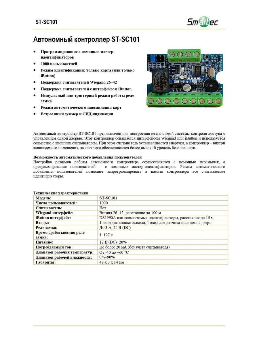 ST-SC101 – автономный контроллер iButton, рассчитан на обслуживание до 1000 пользователей и используется совместно с внешними считывателями. Считыватель устанавливается снаружи, а контроллер – внутри охраняемого помещения, за счет чего обеспечивается высокий уровень безопасности. Благодаря наличию двух типов выходов, Wiegand и iButton, ST-SC101 позволяет подключать как считыватели карт практически любых производителей, так и считыватели ключей-таблеток. Для добавления и удаления из памяти контроллера кодов идентификаторов используется мастер-карта или мастер-ключ, при этом он поддерживает удобный режим автоматического запоминания карт.