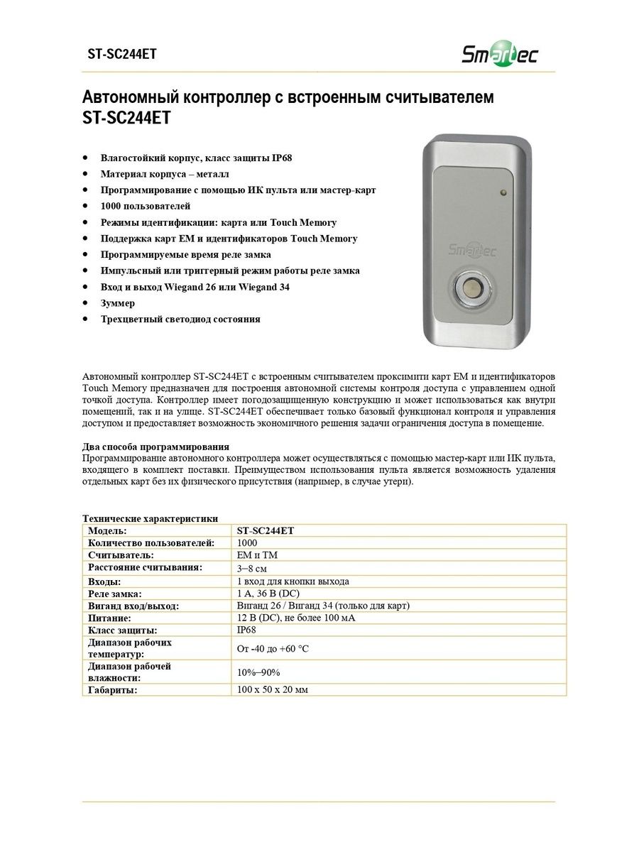 ST-SC244ET – автономные контроллеры Smartec, оснащенные считывателями карт доступа формата Em Marine (EM) и ключей Touch Memory. Устройства предназначены для обслуживания до 1000 пользователей, реализуют базовый функционал контроля и управления доступом и позволяют построить бюджетную однодверную систему. Контроллеры Touch Memory программируются через мастер-карту или ИК-пульт, предоставляют выбор из двух режимов работы реле управления замком (импульсный или триггерный), а класс защиты IP68 предусматривает возможность их эксплуатации в уличных условиях.