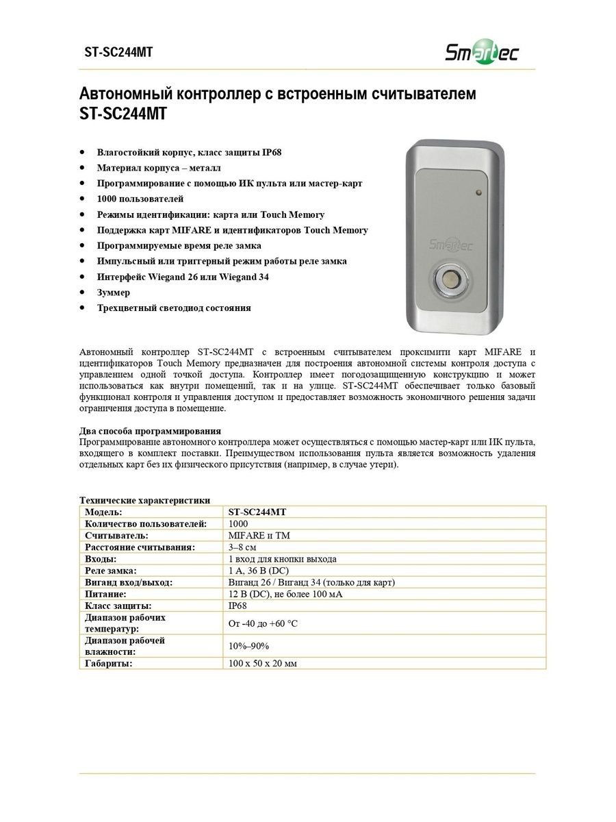 Автономный контроллер ST-SC244MT с встроенным считывателем проксимити карт MIFARE и идентификаторов Touch Memory предназначен для построения автономной системы контроля доступа с управлением одной точкой доступа. Контроллер имеет погодозащищенную конструкцию и может использоваться как внутри помещений, так и на улице. ST-SC244MT обеспечивает только базовый функционал контроля и управления доступом и предоставляет возможность экономичного решения задачи ограничения доступа в помещение.