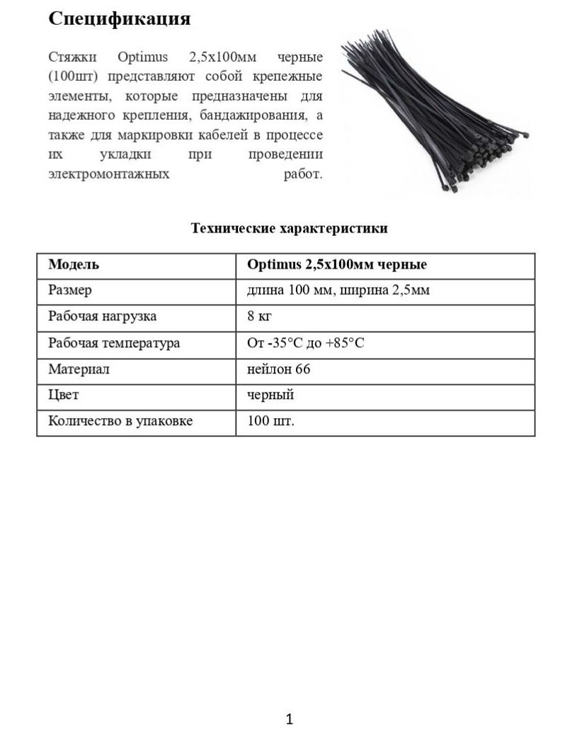 Стяжки Optimus 2,5x100мм черные (100шт) представляют собой крепежные элементы, которые предназначены для надежного крепления, бандажирования, а также для маркировки кабелей в процессе их укладки при проведении электромонтажных работ.